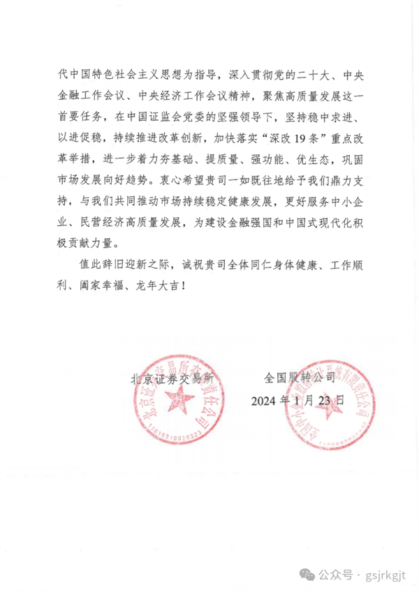 新春到来之际,甘肃股权交易中心喜获北交所、全国股转公司发来的感谢信。2023年,是甘肃股权交易中心与北交所、全国股转公司深化合作的一年,“北交所、全国股转系统甘肃服务基地”揭牌、与全国股转公司签订《监管合作备忘录》启动新三板挂牌“绿色通道”便利机制,联合开展北交所“三服务”甘肃行活动,走访、座谈、一对一诊断、培训企业百余家,基本实现省内市州及兰州新区全覆盖,北交所改革东风吹向陇原大地,为甘肃资本市场高质量发展带来了新的历史机遇。