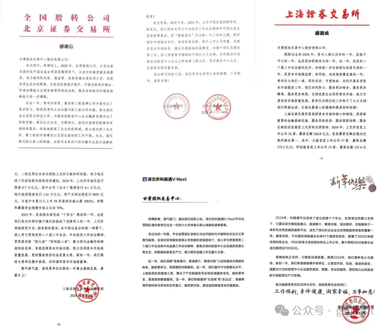近日,甘肃股权交易中心收到北京证券交易所和全国股转公司、上海证券交易所、深圳证券信息有限公司感谢信,对甘肃股权交易中心过去一年给予的支持表示感谢,同时希望未来进一步加强合作交流,凝聚合力服务实体经济高质量发展。