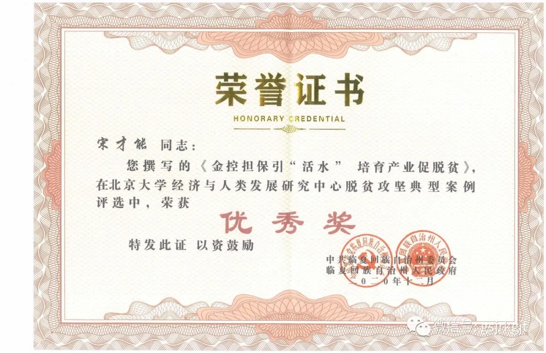 本次评选活动,共有845篇典型案例和15个视频资料入围,最终110个典型案例获奖,金控临夏担保获得表彰,是州委州政府对金控临夏担保扶贫工作的充分肯定,进一步激发了全体员工扎实工作,助力乡村振兴的工作热情。