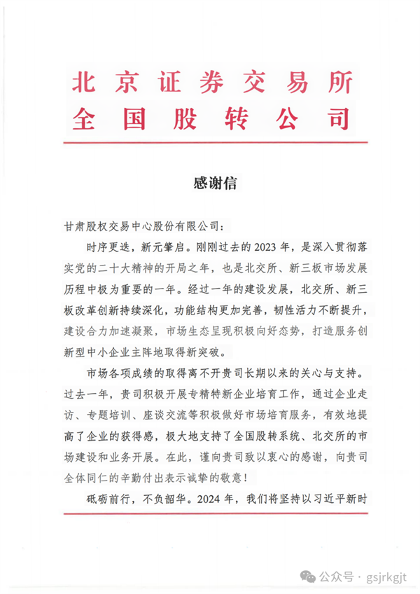 甘肃股权交易中心喜获北交所、全国股转公司感谢信